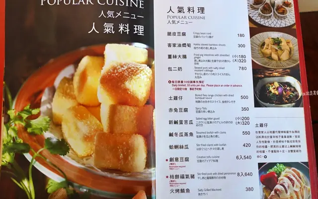 有些品項假日不供應菜單部分包二奶、創意豆腐、柿餅福氣豬需事先預訂每人低消$250,酌收10%服務費