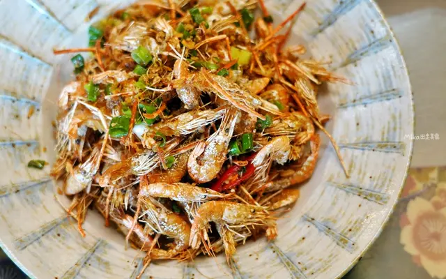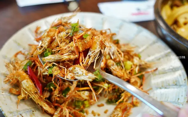 石門水庫撈的小蝦,高溫油炸加入調味爆炒酥脆鹹香又入味,要不是大中午的,還真想點冰啤酒來配。