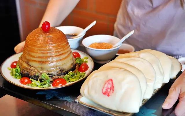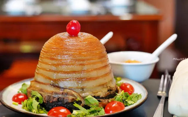 底層是特選的梅乾菜,將五花肉切成約300公分的長條薄片,然後將五花肉繞成大溪陀螺的形狀,上面再放上一顆櫻桃,真的很風情萬種。