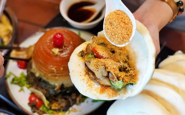 雖然偏肥,但因為搭配梅乾菜還有花生粉、香菜跟特製醬料與割包一起吃,真的很讚欸!其實不會顯得太膩口,應該是梅乾菜、特製醬汁也很加分的原因。