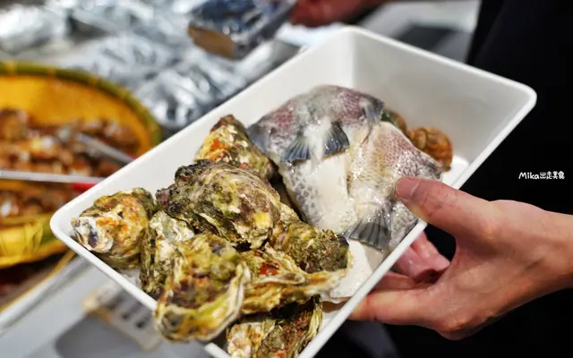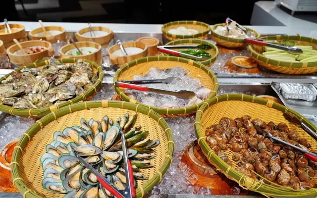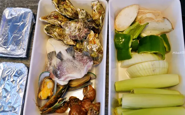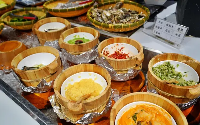 自助區有新鮮牡蠣、鳳螺、魚下巴、淡菜等海鮮食材,蔬菜有洋蔥、玉米筍、青椒..等,加上多種開胃小菜與醬料搭配。還有各種飲料選擇,還有我最喜歡喝的無糖茶喔。