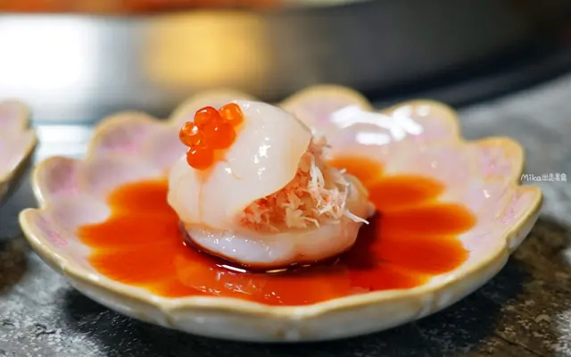 生食級干貝裡面夾著松葉蟹肉絲,上面用鮭魚卵或松露醬點綴,底部是甘口醬油。爽口鮮甜的口感,咬下去海味在嘴裡爆開,太滿足了~~~