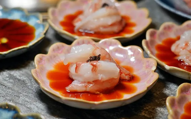 天然赤海老刺身也有加松露醬跟鮭魚卵點綴,很是脆甜甘鮮,擺盤真的很精緻,很有質感。