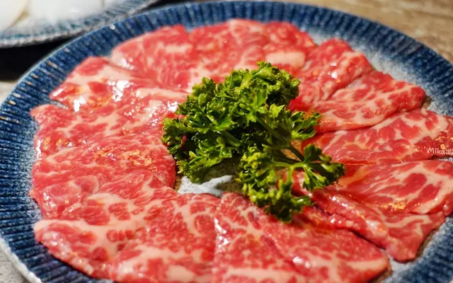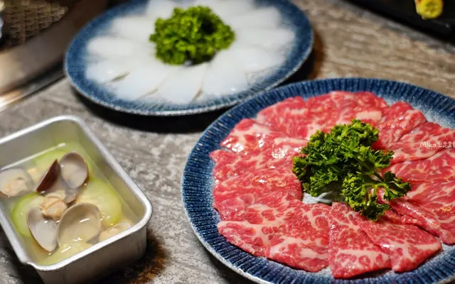 整塊牛小排經過師傅精修手切,把多餘油筋都修掉,只保留最嫩、最有口感的部分,這真的不是吃到飽的水準啦老闆,太精緻了吧!根本日本高級燒肉店的擺盤跟肉質。