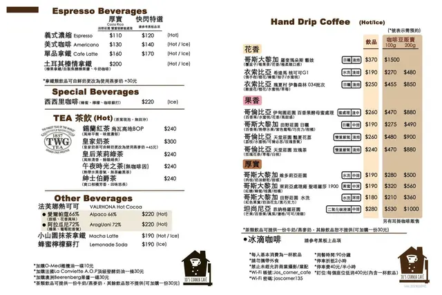 Jo’s Corner Cafe基本上以輕食為主,在中午時段會有比薩類的餐點,算是比較吃得飽的東西,沒有套餐的選項,都是點單點的,單價算是中價位,但搭配它的環境我是覺得還算OK啦