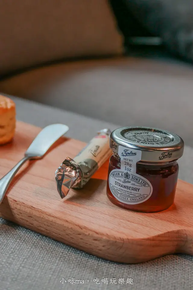 司康組就是兩顆原味司康加上一條法國 La Conviette A.O.P 頂級發酵奶油跟澳洲Beerenberg果醬,果醬有草莓、藍莓、柑橘、黑莓可以選,本來覺得司康好小,結果搭配奶油跟草莓果醬也太好吃了,司康外皮微硬、裡面是鬆軟綿密的口感,La Conviette A.O.P 頂級發酵奶油很香,更添滑順口感,草莓果醬吃不完也可以帶回家喔