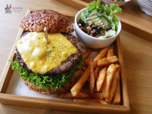 雙層牛肉堡的麵包是起司麵包,比一般漢堡麵包來的有嚼勁,裡面夾了兩層手打牛肉漢堡排,旁邊還附薯條。