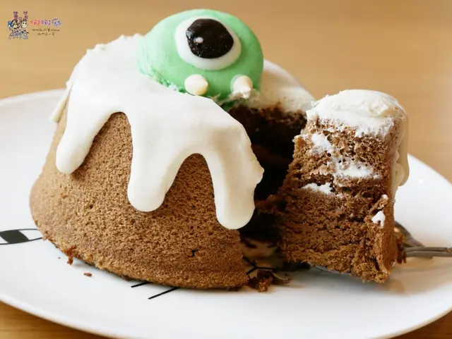 飯後當然要來個甜點,今天是紅茶戚風蛋糕,最近好流行這種富士山造型的蛋糕喔!上面還放一個大眼怪的馬卡龍,蛋糕體本身還不錯,軟綿軟綿的,搭上鮮奶油淋醬蠻剛好的,而且很好拍。可惜有放一點時間,有點被冰箱風乾了。