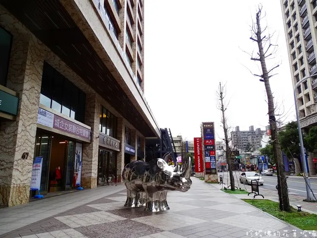 廣場上好多大型犀牛裝置藝術,顏色又金又銀的,好壯觀