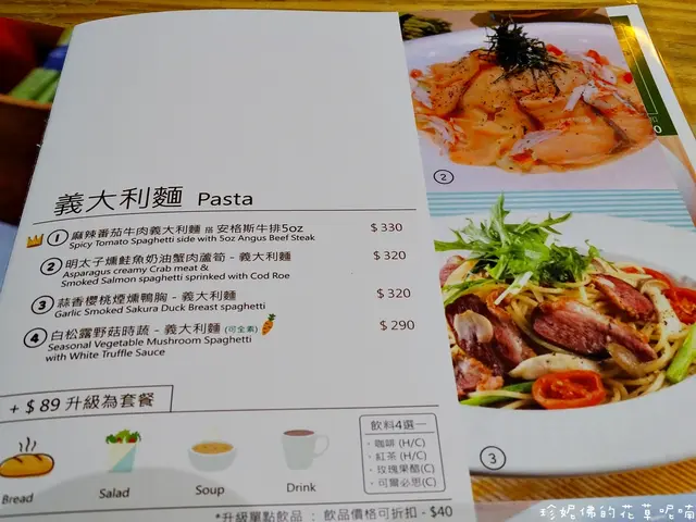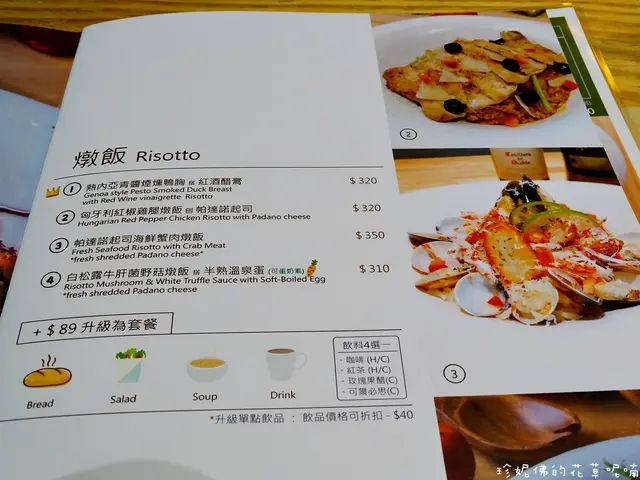 燉飯跟義大利麵的單點價格都三百多,再加89元升級套餐的話一客就要400多了