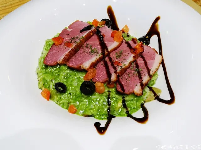 熱內亞青醬煙燻鴨胸燉飯,孩子有喜歡,飯的口感軟硬度剛好,我們覺得還不錯
