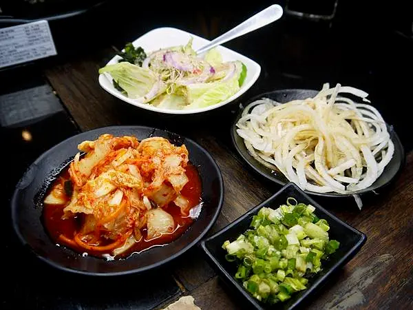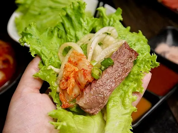 以生菜、泡菜、洋蔥和蔥蒜醬,