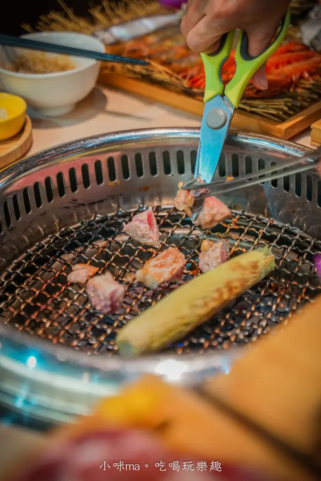 這一塊超大片的肋眼牛排我本來很擔心不會烤,沒想到服務人員自己過來幫我們服務,先烤到微熟後用剪刀分成小小塊,配上店員的功力,本來對這塊肉沒興趣的我竟然他這油亮又微焦的模樣給吸引,筷子都準備好要夾了~