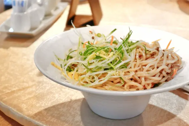 手工麵條Q彈好勁道,伴隨著鹹香肉醬與料一起入口,裡面的配料有蛋絲、小黃瓜、紅蘿蔔、特製肉醬、香菜等,還加入辣醬與蝦增加口感,醬料都均勻巴在麵上,小辣的辣感刺激著味蕾帶來爽快的層次感,是一上桌轉一圈就迅速完食的美味。