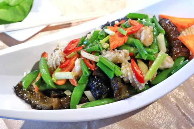 大火快炒滿滿海鮮,裡面的蝦子以貼心去殼、烏參好滑溜、花枝很軟有彈性,配上豆莢、大蔥增加爽口及脆口度,鮮到澎派又不失清爽。