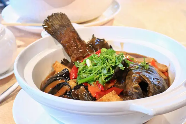 一大尾新鮮石斑魚加以秘製醬汁熬煮,魚肉很細緻但也帶了些刺吃起來要小心,