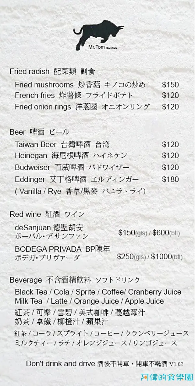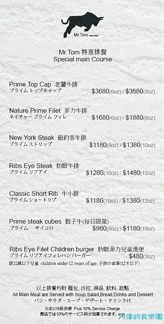 阿偉家住新北市,有時想吃一道美國Prime級的牛排,都得到台北,而且一套吃下來大概兩千跑不掉。最近聽桃園的部落客好友蘋果樹推薦,位於龜山有一間深受在地人喜愛的牛排店-Mr.Tom,已經開業十多年,用的就是Prime級美牛,好吃但價位卻相對平實。不過這家店在今年夏天因為原來的業主要舉家搬去宜蘭,本想收掉這家店,後來被一熟客知道了,決定接手經營。所以七月一日起,這位從熟客變老闆的胡大哥接手,但肉品供應及店裡主廚都沒有變,品質繼續維持。阿偉在八月下旬的假日接到胡老闆的邀請,前來大快朵頤!