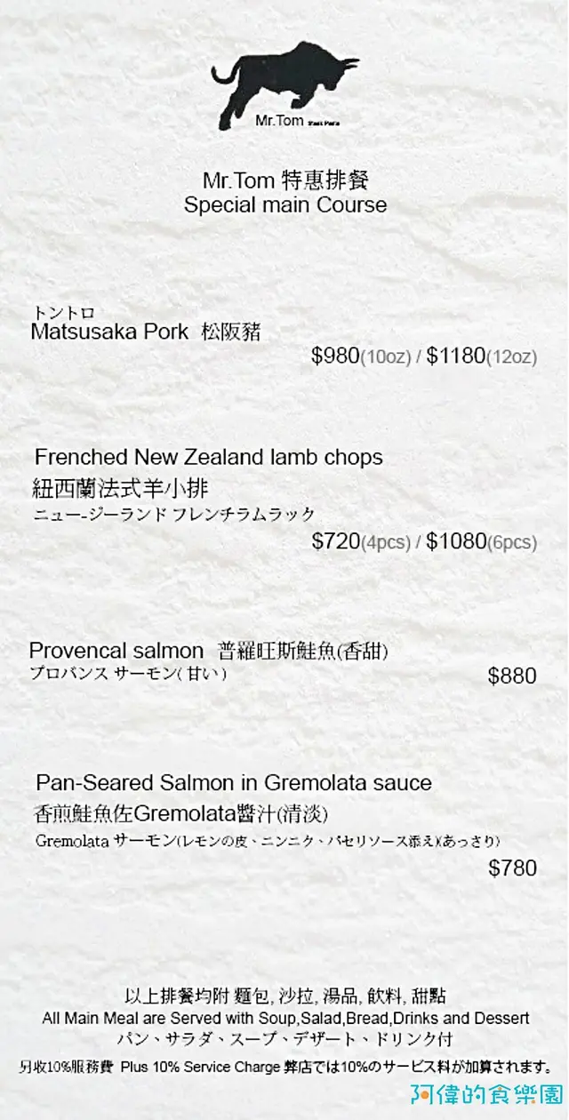 可以發現其實MENU的內容蠻簡單,新老闆說他希望專心經營”牛排”這一塊,當然也因應不吃牛的客群,提供松阪豬、鮭魚排等餐點。所有排餐皆附麵包、沙拉、湯品、飲料、甜點,這些附餐竟然可以免費續吃,也實在太甘心了!