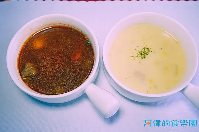 湯品的部份:(左)牛肉蔬菜湯(右)玉米濃湯