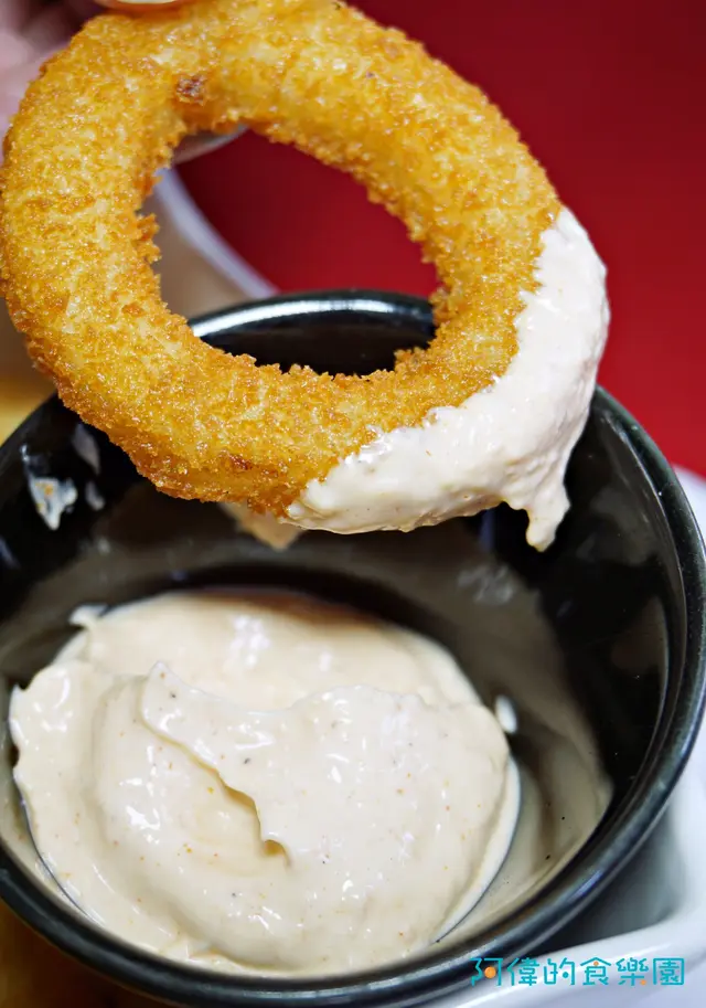 阿偉好久沒吃到這麼好吃的洋蔥圈及薯條了,小碟中裝的是”蒜味醬”,阿偉強力推薦!非常非常好吃,拿來沾洋蔥圈與薯條非常加分!