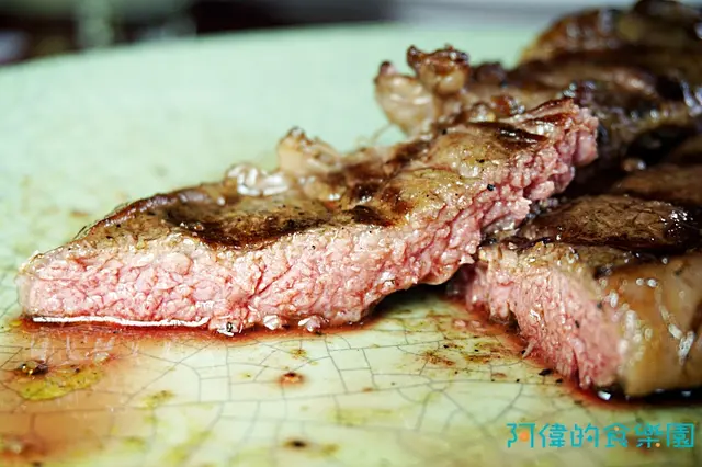 這裡的牛排都以三分熟上桌(除非你有特別要求其他的熟度),可以發現三分熟的肉質只有粉嫩,不至於有血水。藏在其中的油脂使得它一咬下去,肉汁立刻溢出,口中都是滿滿的美牛香甜味,且肉質超軟嫩,表面的香料與胡椒帶一點鹹度,更為提味。阿偉很久沒吃到這麼甜美的牛排了,吃的時候感覺超幸福又滿足!大推