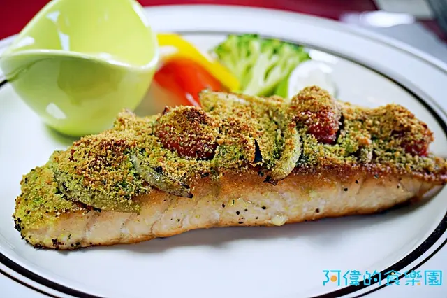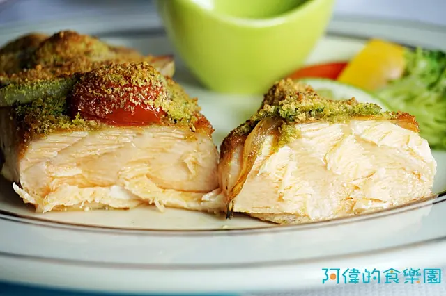 側面看就看出這塊鮭魚排的份量,長度與厚度都蠻夠的。表層用了很像大蒜麵包上的蒜酥醬,以及番茄、洋蔥去烤,味道蠻香,口感帶點酥脆。
