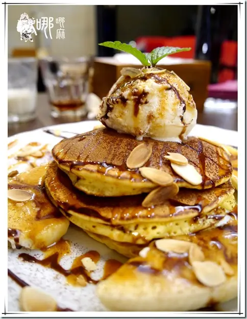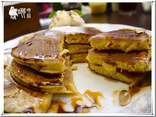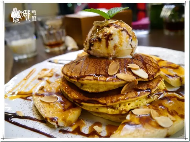 以焦糖和巧克力醬淋在煎餅上,再灑上杏仁片,