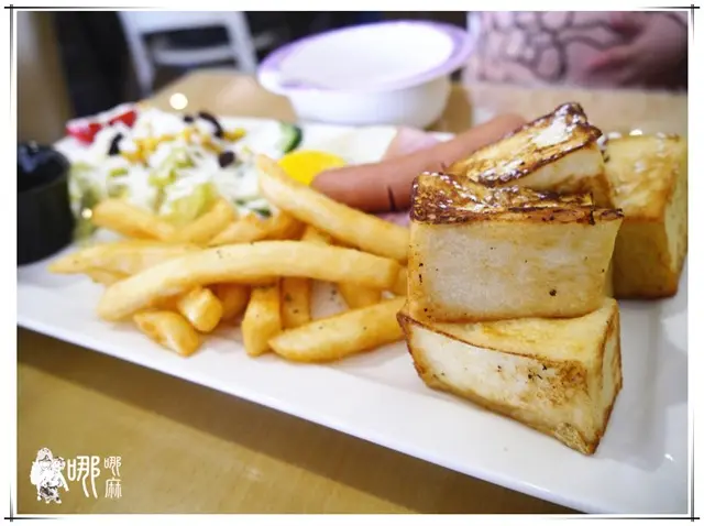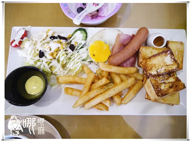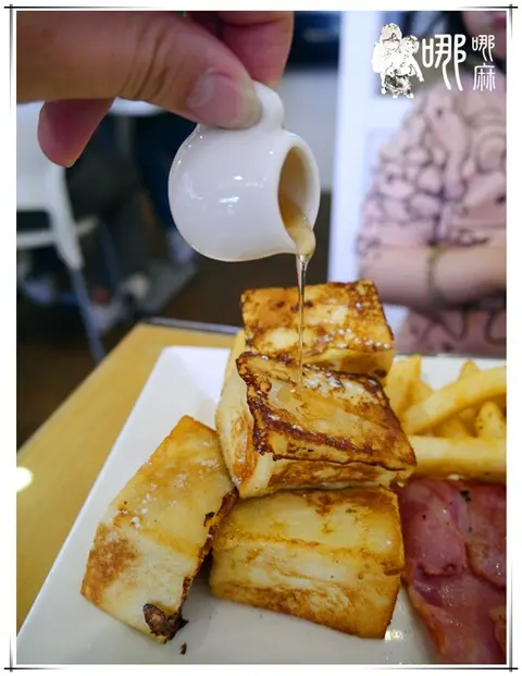 是說這樣看還蠻大根的耶!哪哪麻也挺想咬上一口。法式土司當然少不了糖漿蜂蜜之類的,