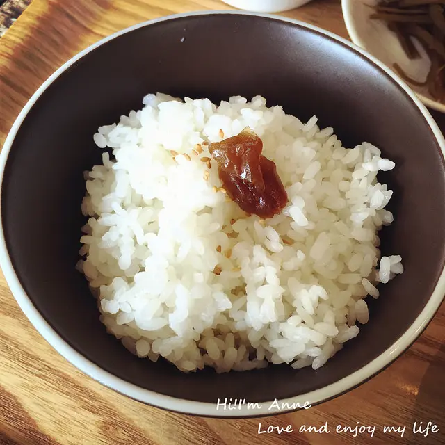 豆腐和白米飯上搭配的醃製紫蘇梅意外的合適