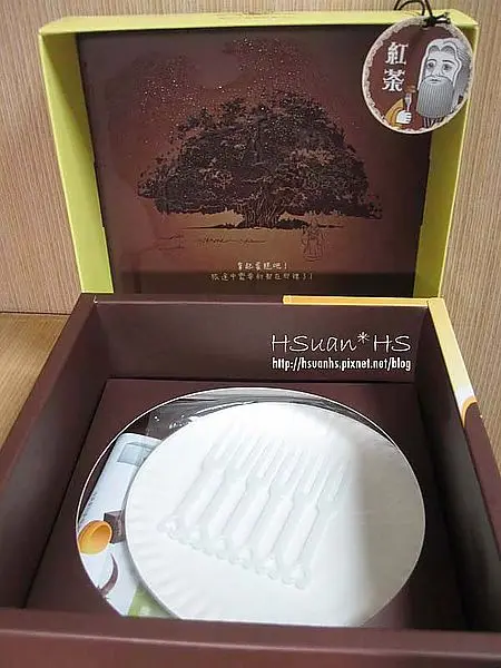蛋糕拿起後,盒子底部有叉子、盤子、塑膠刀。