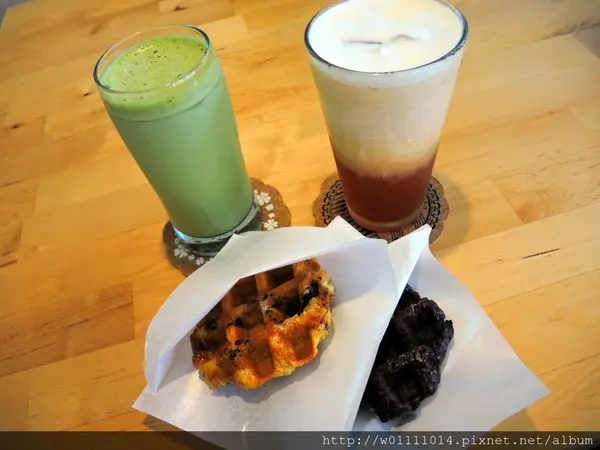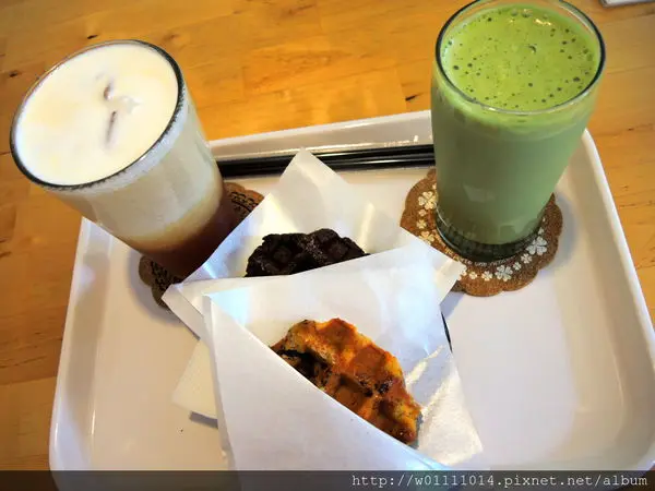 我點的是抹茶拿鐵跟錫蘭鮮奶茶,鬆餅是巧克力跟焦糖OREO口味