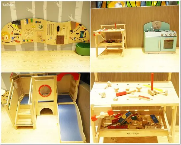 玩具也都是原木系列的,廚房組、工具組讓小孩子可以盡情角色扮演,小BABY也有小小溜滑梯可以過溜滑梯的癮。