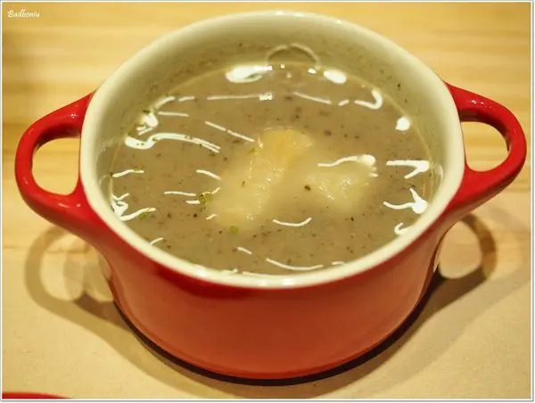 湯是蘑菇濃湯,用小小鐵鑄鍋裝著,看起來很有氣質XD 不過蘑菇這口味可能就不是每一個人都能接受,而且波妞媽覺得湯可以再熱一點會更好,而愛喝湯的波妞爸竟然喝一口就把蓋子蓋上不肯喝了。