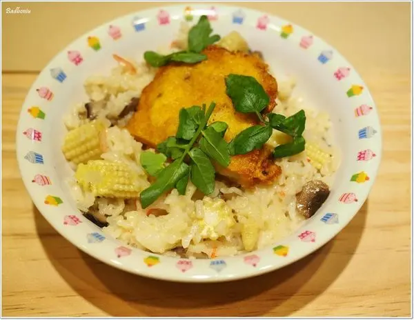 兒童餐的主菜其實是這個煎小魚排+蟹肉奶油燉飯,用料很實在,飯也燉得很軟很適合給小朋友吃,但咱們家波妞只顧著玩,哼。
