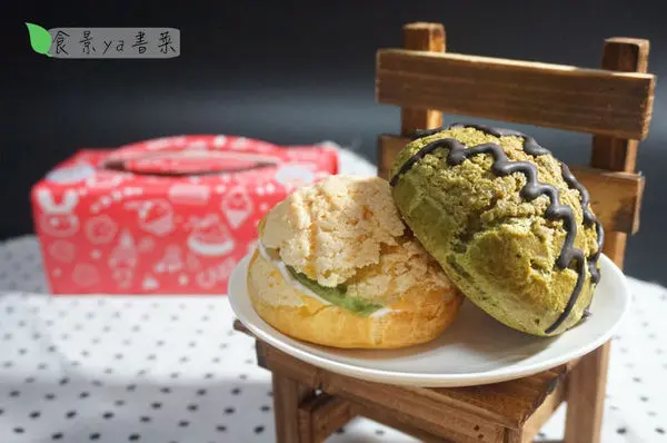 從側面看,會覺得這款泡芙有冰火菠蘿縮小版的感覺,從這角度看就能看到泡芙中的內餡了。