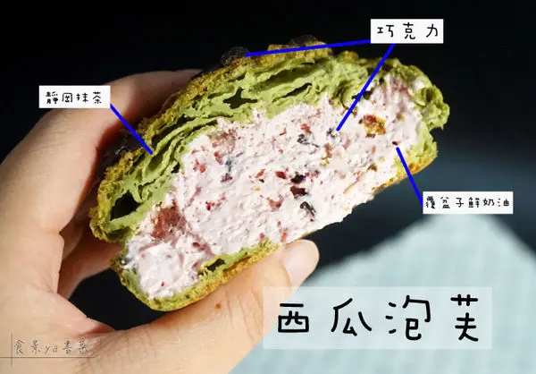 西瓜泡芙的外皮使用的是日本進口的靜岡抹茶,中間的內餡是覆盆子鮮奶油,而西瓜的紋路及籽則是巧克力。