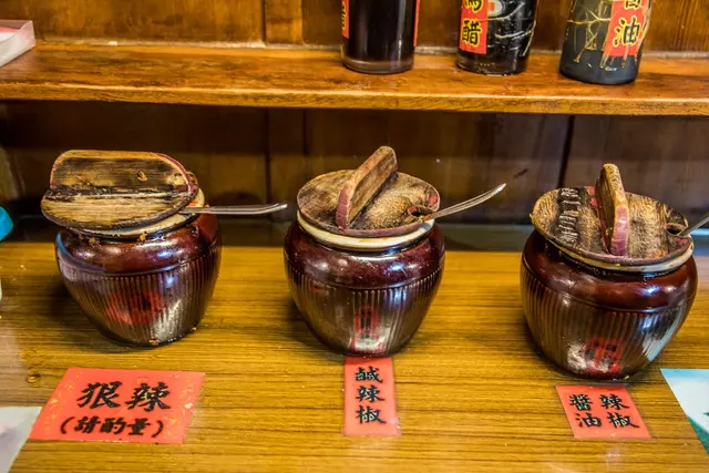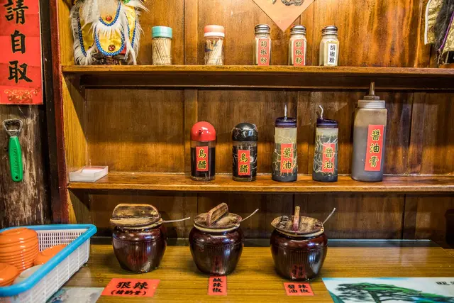 放調味料的地方也是歷史感十足,醬料整齊擺放,辣椒都是老闆自製的,有三種辣椒,左邊那個真的辣,請斟酌使用