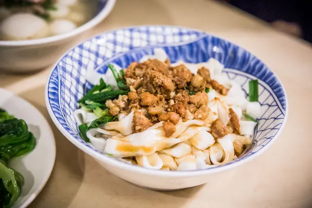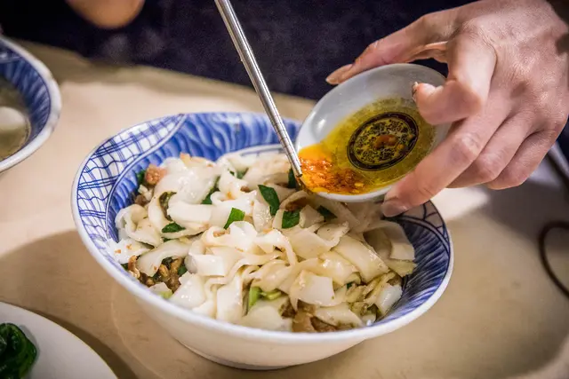 乾粄條,標準客家乾粄條,簡單肉燥、油蔥、韭菜等,看似簡單但味道很有深度,粄條又Q又有米香,這跟我小時候吃的一模一樣味道都沒變過,加點辣椒醬跟醬油膏就很美味了