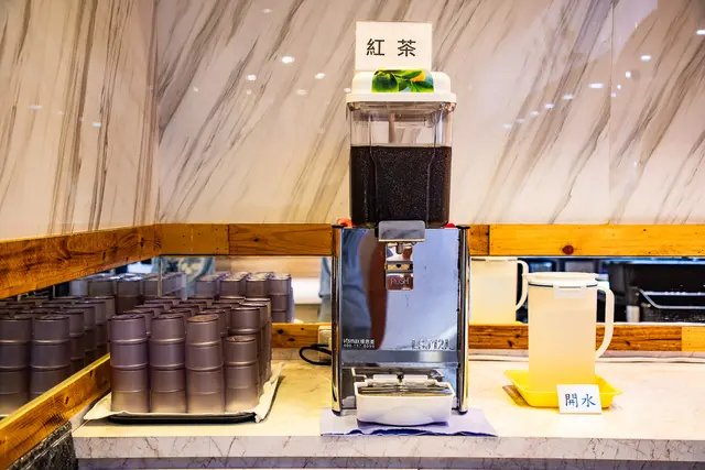 後方在自助區,有紅茶跟開水可以自己裝,無限量供應