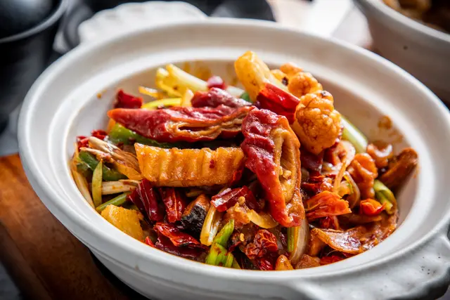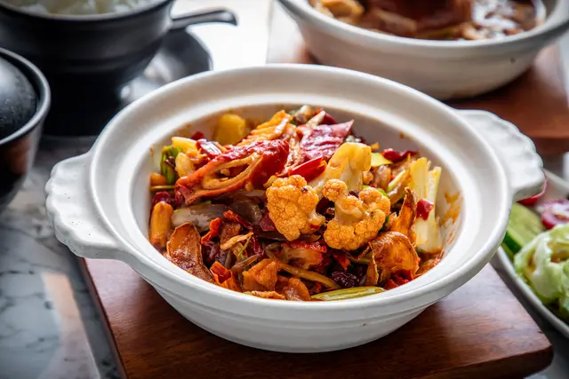 乾鍋肥腸,跟一般切成圈型的大腸不一樣,這裡是剖切成片狀,而且經過干鍋爆炒,大腸的肥油都被逼出來,吃起來脆中帶嫩,一點腥味都沒有,加上麻辣口味爆炒,十足下飯菜的狠角色