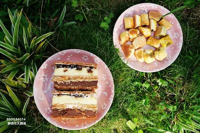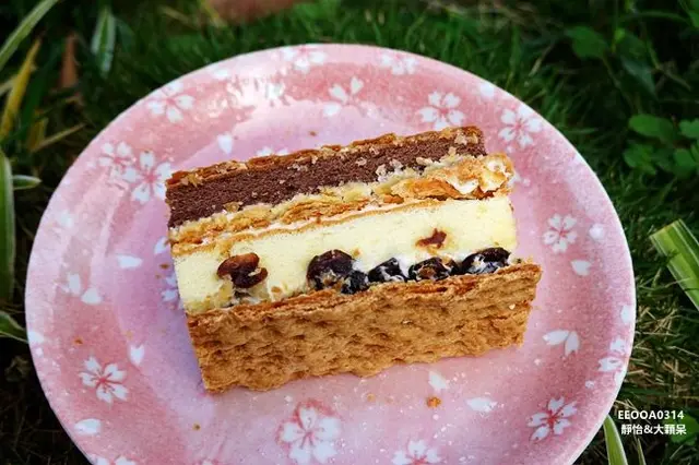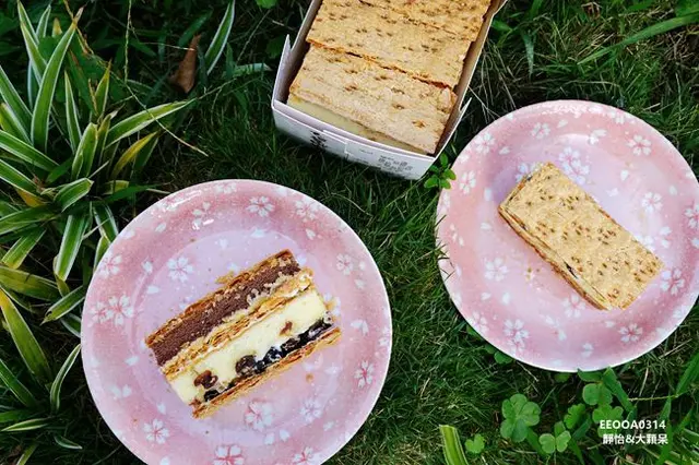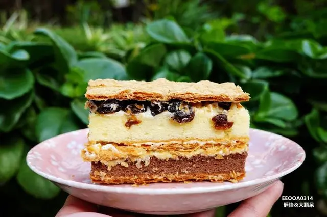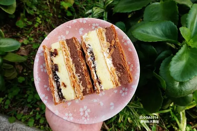 每一層都是不同的感受,【大溪拿破崙派】擁有三層派皮的酥脆口感,夾層裡有核桃與葡萄乾,戚風蛋糕有香草及巧克力兩種風味,香濃綿密搭配純手工奶油,豐富的口感讓人每一口都難忘,幸福感油然而生,看似甜膩吃起來卻是細緻柔滑,甜而不膩,我一次可以吃兩三片沒問題,越吃越順口!