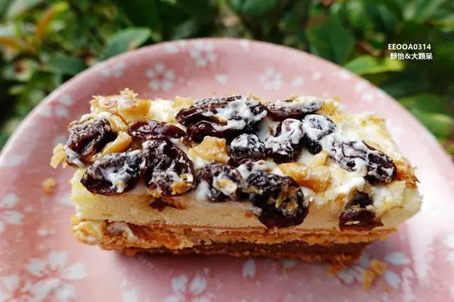 超吸睛的外表,可以看出用料相當實在,鋪滿滿的葡萄乾及核桃也太誘人,美味好吃外也相當好拍,想要拍美美的IG甜點照就是它了!