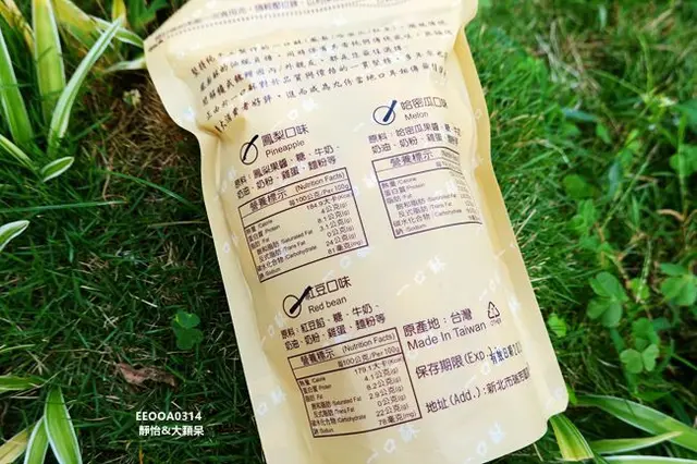 除了【大溪拿破崙派】,他們家的一口酥也相當推薦,一共有三種口味:哈密瓜、紅豆及鳳梨,原料、營養標示及保存期限等外袋都有清楚標示,一包$150元