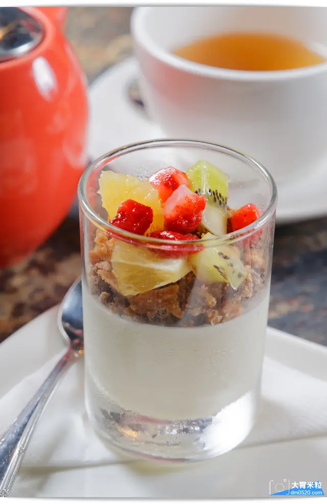 鮮奶酪上層放上繽紛的水果丁與巧克力碎片,吃起來好綿密!