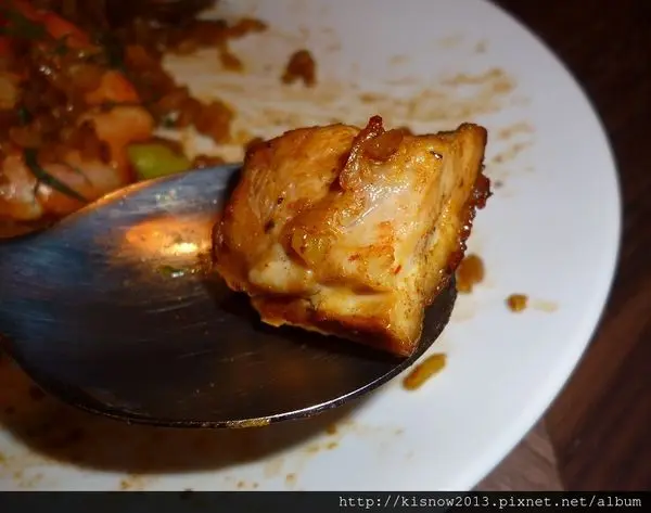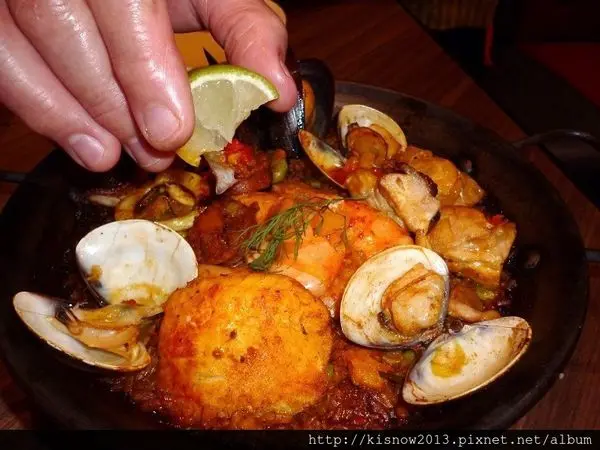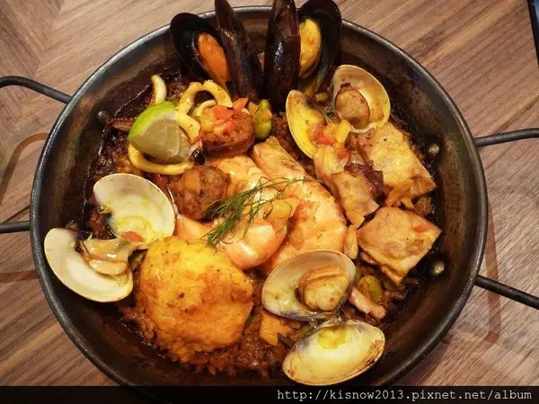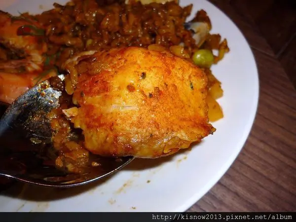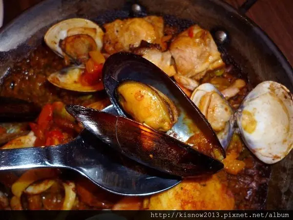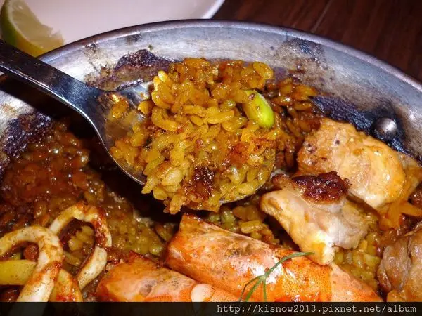 黃色的飯粒吃起來的口感類似炒飯,飯粒熟度剛好,油度和濕度也配合適宜,具有蕃紅花獨特滋味,並且拌隨海鮮的風味,淡菜肉質較少,口感鮮嫩,魚塊外表薄酥,口感上清淡軟嫩,雞肉塊肉質偏紮實,充份吸附蕃紅花和海鮮的滋味,口感稍微偏鹹.鮮蝦長鬚部份剔除,吃起來的口感紮實鮮美,蛤蜊肉質新鮮細嫩,吸收蕃紅花特別的滋味,在口感上比較偏鹹.