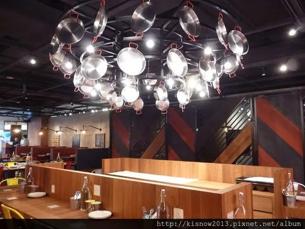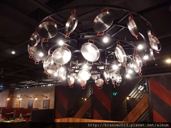 亮晶晶一大群的平底鍋懸掛在天花板上,圍成一圈又一圈,如同吊飾一般,取代常見的水晶燈,除了相當吸睛,也突顯這家店西班牙鍋飯的特色.