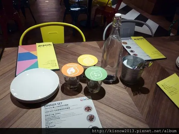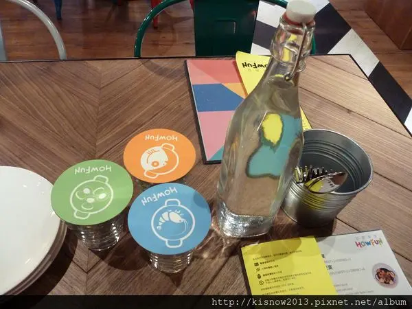 桌上除了菜單和餐具,還擺設水杯和飲用水瓶,每一個水杯都有一個可愛粉嫩的杯墊.