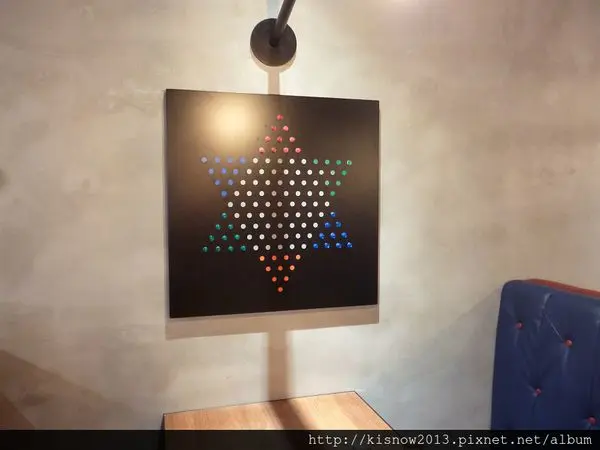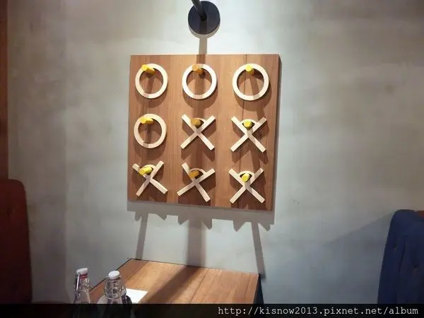 如果再試著尋找這家店的特色,意外發現牆上有圈叉棋和跳棋星型圖案,這一部份的牆壁很有童趣話題,圈叉棋令我想到學生時代,常常和同學在練習薄或筆記本塗鴨之用,三個圖案連成一排就是賓果,很希望常常遇見賓果,可惜也常常事與願違.