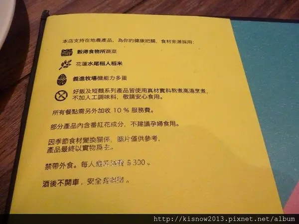 這家店每人最低消費約300元,禁帶外食,另收10%的服務費,店內食材支持台灣在地農產品,採用真材實料烹煮,不加人工調味料.