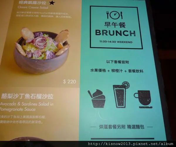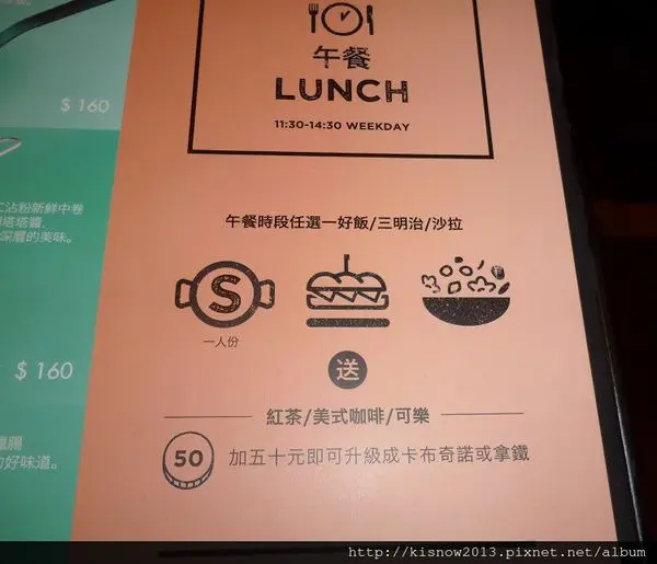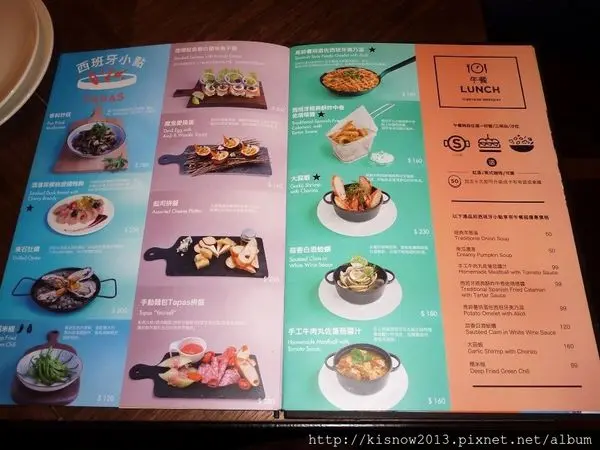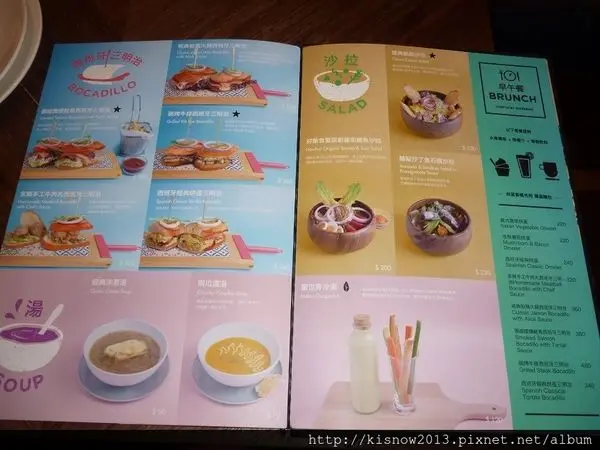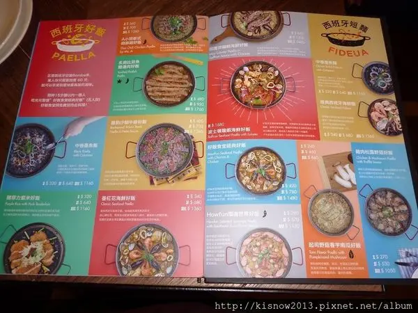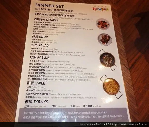 這家店的餐點以西班牙鍋飯為主,也是這家店的特色,各式的鍋飯排列真的琳琅滿目,除了西班牙鍋飯,兼賣三明治早午餐,以及西班牙小點,甜點和飲料.午餐時段只要點任何一樣好飯,三明治或沙拉,都可以送一杯紅茶,可樂和美式咖啡.加50元可以升級成卡布奇諾或拿鐵;早午餐部份有附水果優格+飲料+柳橙汁,烘蛋套餐另附麵包.